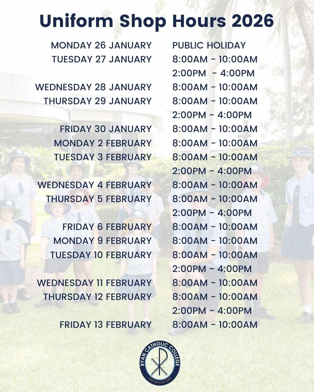 Secondary students - FORMAL uniform is to be worn on Wednesday and Friday, and HOUSE uniform on Monday, Tuesday and Thursday.